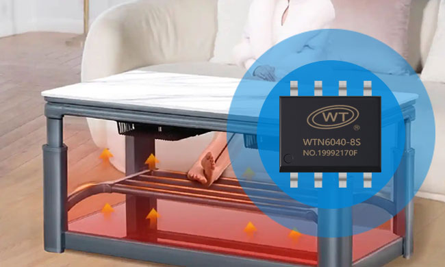 随着智能家居市场的不断发展,越来越多的家用电器开始走向智能化与人性化。智能取暖桌作为近年来兴起的一款兼具实用性与科技感的产品,凭借其舒适的取暖体验和多功能应用,受到了广大消费者的青睐。然而,如何在保证产品取暖效果的同时,进一步提升操作便捷性和用户体验,成为厂商在产品升级中必须解决的课题。在这一背景下,广州唯创电子推出的 WTN6040-8S 语音芯片,为智能取暖桌提供了理想的解决方案。