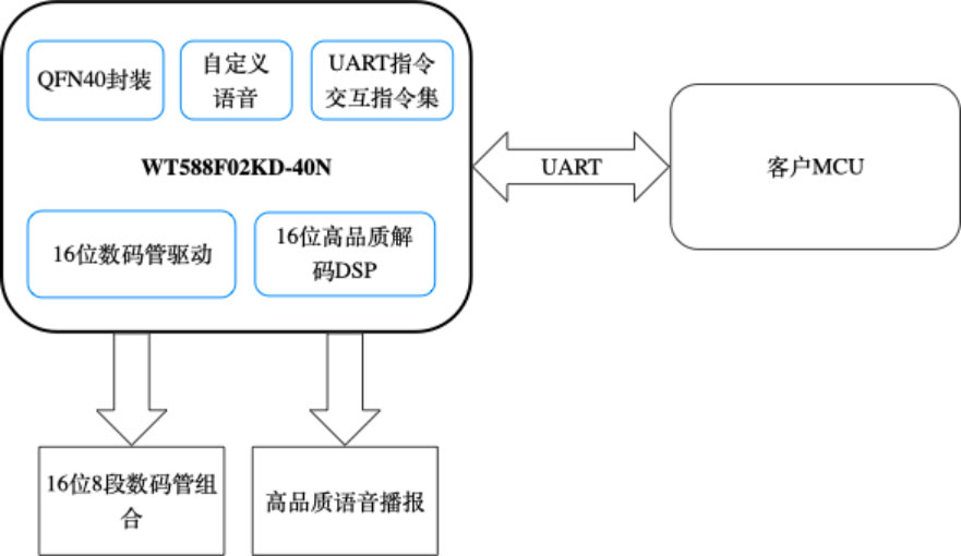 作为深耕音频领域多年的专业语音IC厂家,广州唯创电子推出的WT588F02KD-40N,直击行业痛点,首次在单芯片内实现了 “语音播报、数码管驱动、按键扫描” 的三合一高度集成。