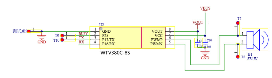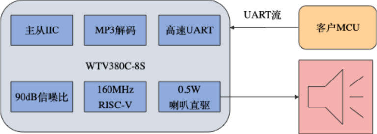 流式传输,化繁为简: 主控MCU无需预存大量音频文件,只需通过标准的UART接口(波特率115200),即可实时地向WTV380C-8S发送MP3音频数据流(支持32Kbps),芯片即时解码播放。这极大地降低了对主控MCU的性能和资源要求。单芯片集成: 芯片内部集成了音频解码器、0.5W D类功放以及必要的控制电路,形成完整的音频播放系统。开发者无需再为繁杂的外围元件设计而烦恼,真正实现了“即插即用”。