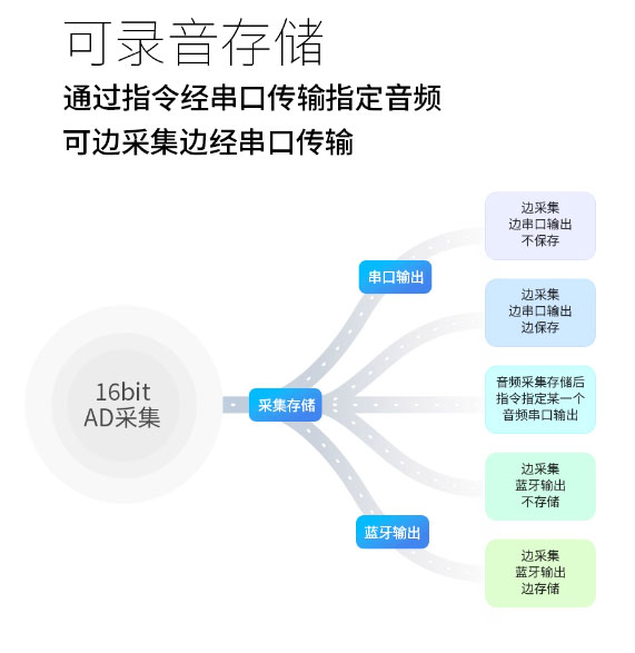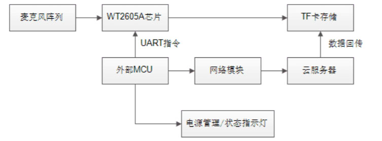 灵活云端同步的能力源自模块化设计理念。WT2605A仅负责音频采集、处理与本地存储,将网络传输任务完全交由主控MCU及通信模块(Wi-Fi/4G/5G)。这种架构使方案能够灵活适配不同网络环境——在企业内网中通过Wi-Fi实时同步,在移动场景下借助4G网络按需上传,在无网络环境下则安全存储于本地,待网络恢复后自动续传。
