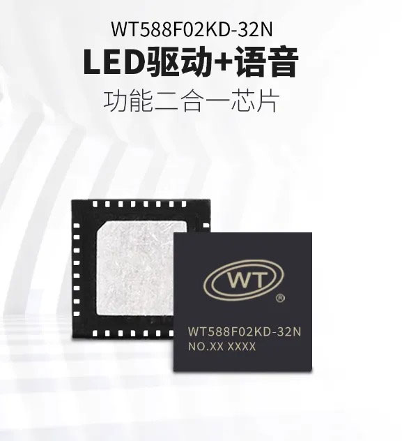针对上述痛点,广州唯创电子作为专业的语音IC厂家,推出了集成创新的WT588F02KD-32N芯片。其核心突破在于将LED驱动芯片与高品质语音引擎深度融合,开创了“声光协同”的智能交互范式。