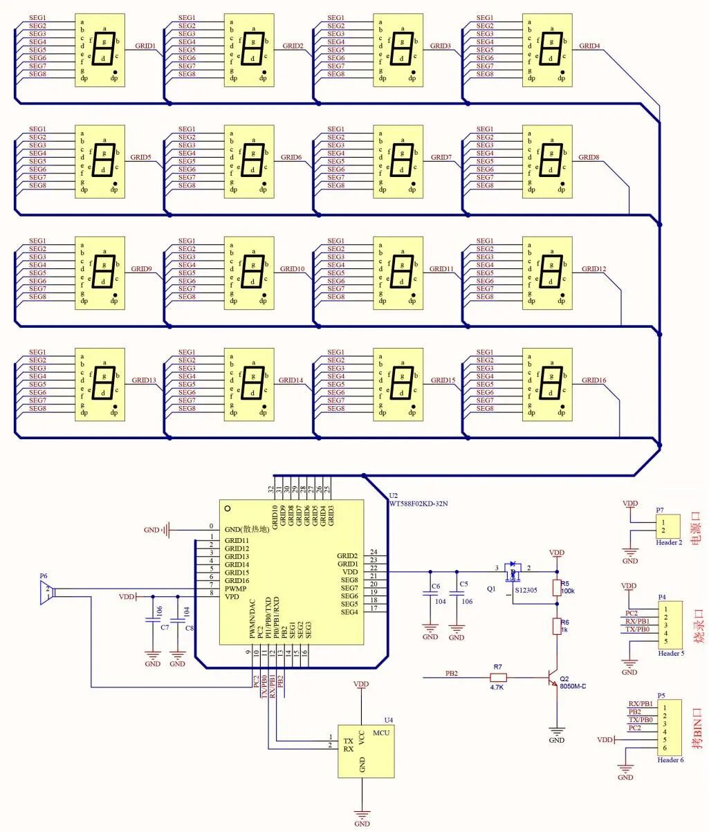 “三位一体”的高集成架构是成本与可靠性的基石。该芯片首次将16位DSP语音处理器、矩阵式LED驱动(8段×16栅)以及0.5W PWM功放集成于仅4.9×6mm的QFN32封装内。这彻底取代了传统方案中所需的“MCU + 语音IC + 显示驱动IC + 外置功放”多芯片组合,不仅将相关BOM成本降低30%-50%,更大幅简化了PCB布局,提升了整机可靠性。