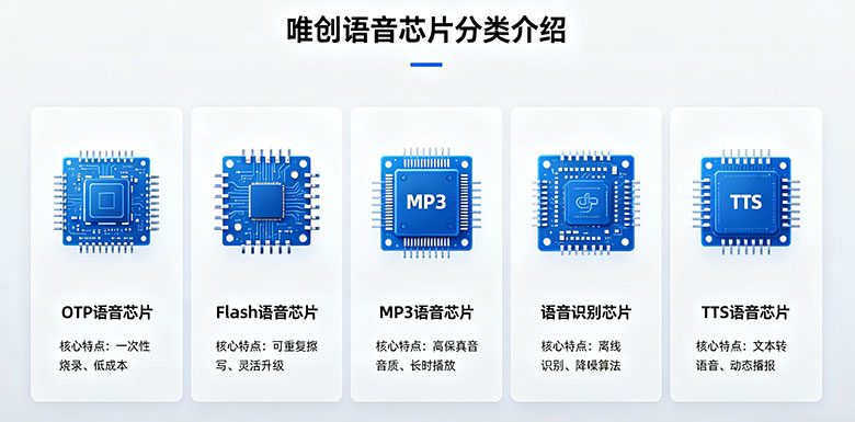 根据功能方向的不同,语音芯片可以划分为语音播放芯片、语音识别芯片和语音合成(TTS)芯片三大类。其中播放类芯片又按照存储与编程方式的不同,进一步细分为OTP语音芯片、Flash语音芯片、MP3语音芯片等主流型号。