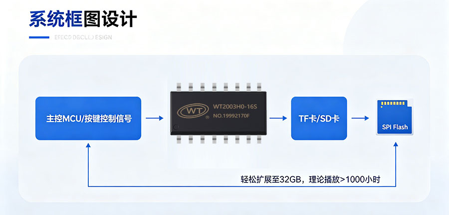 WT2003H与WT2605系列则专为需要长时间运行且追求高保真音质的播放场景量身打造。。该系列允许外接最高32GB容量的TF存储卡,理论播放时长突破1000小时,更支持44.1kHz的高采样率输出,音质表现足以媲美CD级别,非常适合对声音还原度有苛刻要求的设备。