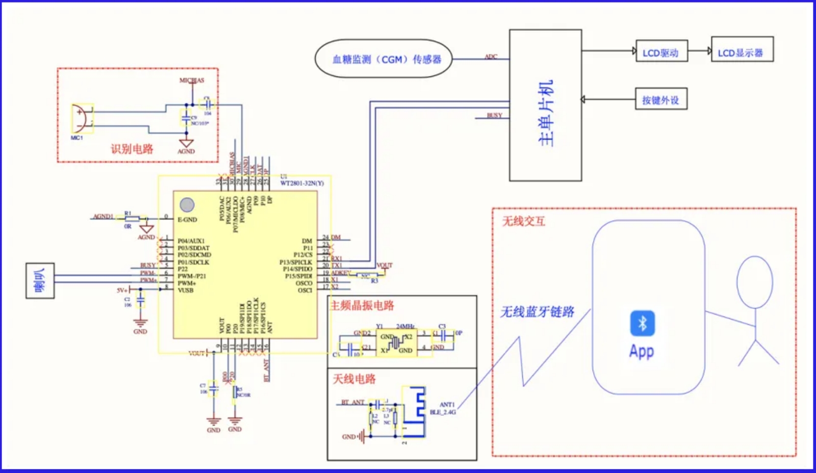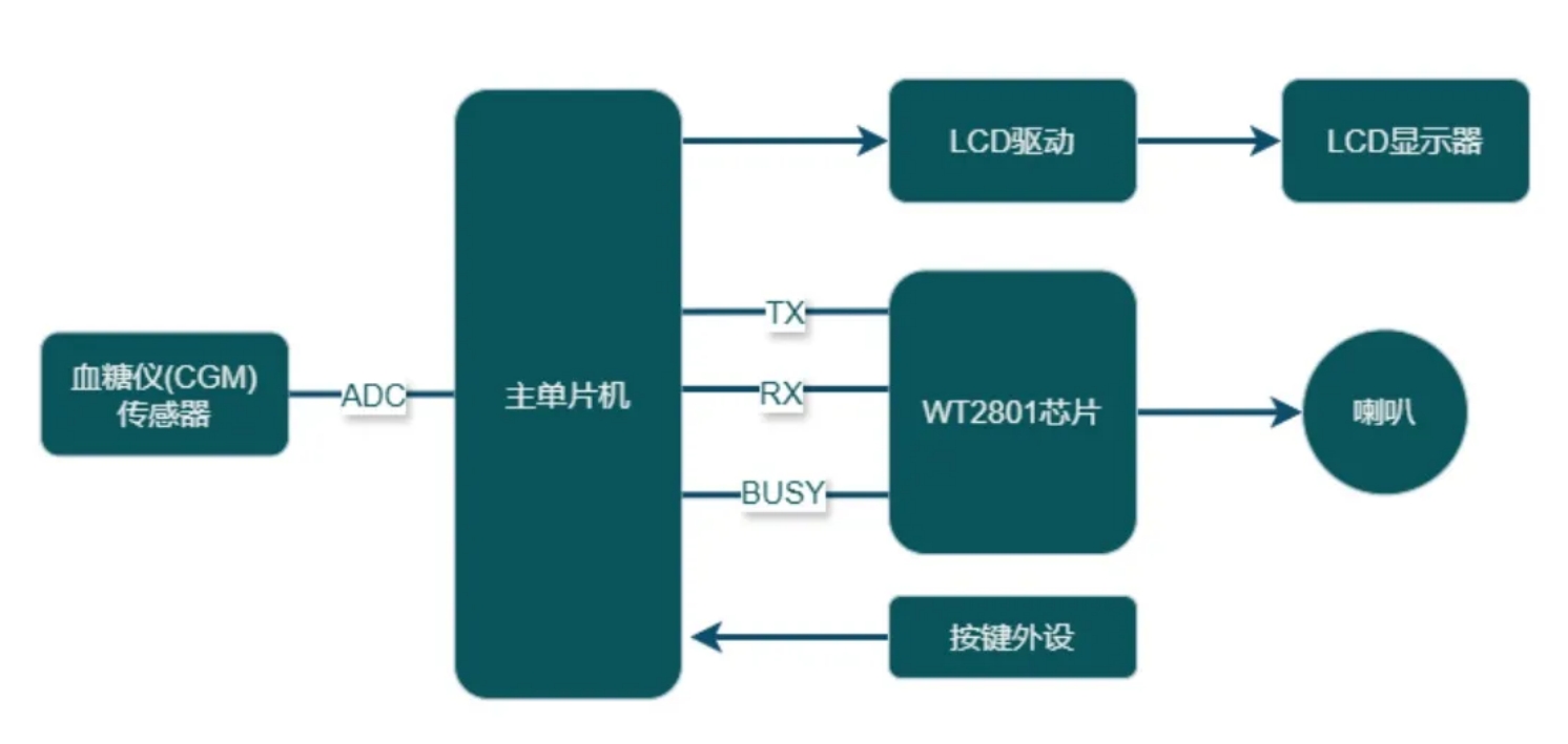 ⾸先,CGM⾎糖监测传感器就像这个管家的"触觉",通过采集指尖微量⾎液,精准感知⾎糖浓度。接着,主MCU充当"⼤脑"的⻆⾊,将传感器信号转换为数字信息。这个时候,WT2801蓝牙语音芯⽚就闪亮登场了!它就像智慧管家的"嘴巴",不仅能清晰地说出"⾎糖值5.8 mmol/L",还能贴⼼地提醒"请插⼊试纸",甚⾄在⾎糖异常时温柔地建议"⾎糖偏低,请补充糖分"。