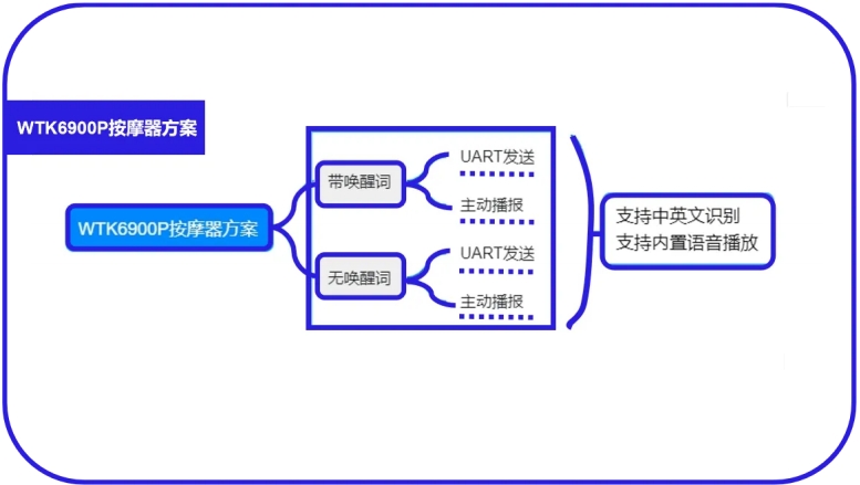 更值得⼀提的是,WTK6900P语音识别芯片⽀持15条本地词条定制,可以根据不同按摩器的功能特点,设计最适合的语⾳指令集。⽐如: