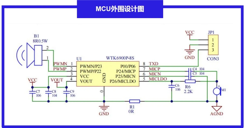 在竞争激烈的按摩器市场,成本控制⾄关重要。WTK6900P语音识别芯片的⼀⼤亮点在于,它能以最低的成本为产品赋能。传统语⾳交互⽅案可能需要20多个外围元件,⽽WTK6900P语音识别芯片的外围电路仅需不超过10个元器件!这种极简设计不仅降低了物料成本,还简化了PCB设计和⽣产⼯艺,进⼀步压缩了总体成本。
