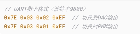虽然厂商建议默认PWM,但DAC模式可通过单条指令激活: