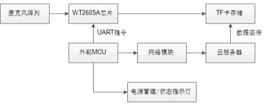 灵活云端同步的能力源自模块化设计理念。WT2605A仅负责音频采集、处理与本地存储,将网络传输任务完全交由主控MCU及通信模块(Wi-Fi/4G/5G)。这种架构使方案能够灵活适配不同网络环境——在企业内网中通过Wi-Fi实时同步,在移动场景下借助4G网络按需上传,在无网络环境下则安全存储于本地,待网络恢复后自动续传。
