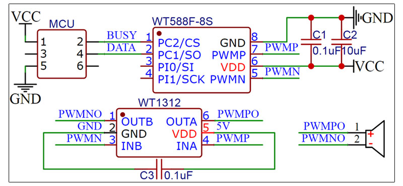 WT588F(E)系列Flash语音芯片一线串口外接WT1312功放芯片应用原理图