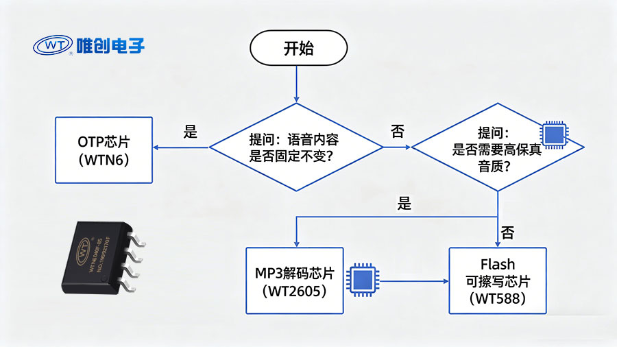 第一步:明确语音需求类型。 如果语音内容固定且永不更改,优先选择OTP芯片(如WTN6系列);如果需要频繁更新语音内容,选择Flash可重复烧录芯片(如WT588、WTV、WT2003H系列);如果对音质有高要求,选择MP3高音质解码芯片(如WTV、WT2605系列);如果需要录音或语音识别功能,则选择对应的录音芯片或识别芯片。