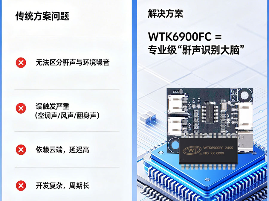 在智能穿戴和智慧卧室赛道上,你是否正面临这样的困境:明明用了高灵敏度的麦克风,语音识别芯片却总把伴侣的翻身声、窗外的车流声误报为打鼾?传统方案功耗高、集成难,导致手环或床垫产品续航尿崩、结构臃肿?